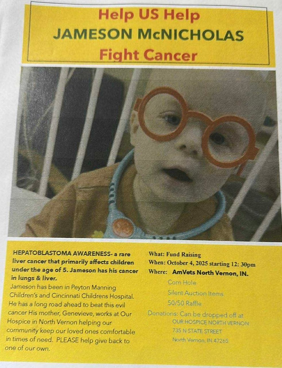 Jameson has been in Peyton Manning Childrens and Cincinnati Childrens Hospital. He has a long road ahead to beat this evil cancer. His mother, Genevieve, works at Our Hospice in North Vernon helping our community keep our loved ones comfortable in times of need. Please help give back to one of our own.